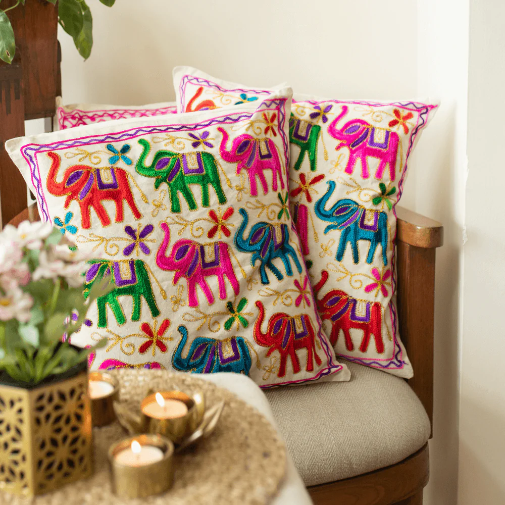 Elephant Aari Embroidery Cushion Cover (Set of 2)