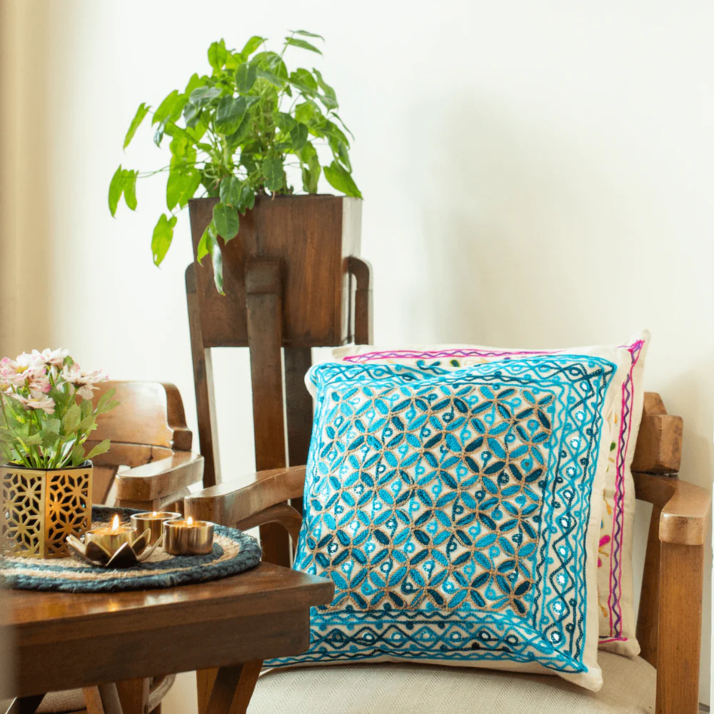 Looking for Aari embroidered cushion covers online? Handcrafted by artisans of Gujarat, this Aari embroidered cushion cover – blue colour cushion cover will brighten up your room.